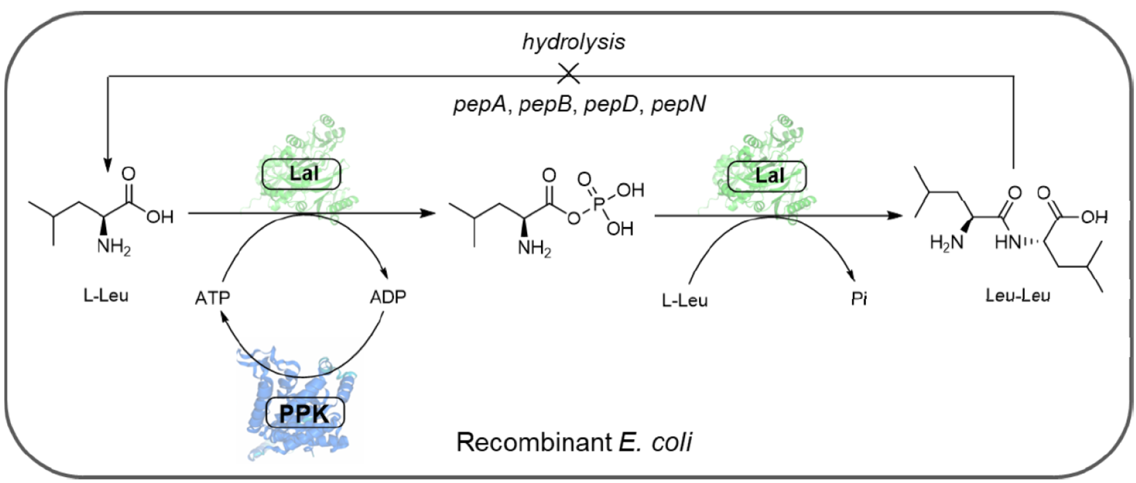 近日,永兴集团yx5978孙周通研究员带领团队,通过数据挖掘从 Pseudomonas sessilinigenes 中发现了一种新型L-氨基酸连接酶Lal,其催化效率(kcat/Km)是已知酶TabS的3.54倍,且热稳定性(Tm = 57 °C)较TabS(Tm = 39 °C)有显著提升。为解决二肽在宿主内易被降解的问题,研究人员利用CRISPR-Cas9系统敲除了大肠杆菌中四个内源性肽水解酶基因(pepA、pepB、pepD、pepN),成功构建了二肽积累能力显著增强的工程菌株。为进一步实现ATP自供给,引入来源于 Erysipelotrichaceae bacterium的多聚磷酸激酶EbPPK,建立了不依赖外源添加ATP的全细胞催化体系。通过系统优化共表达策略与反应条件,最终在20 mL反应体系中实现了 Leu-Leu 二肽的高效生物合成,时空产率达23.85 g/L/d,较初始菌株提升225%。