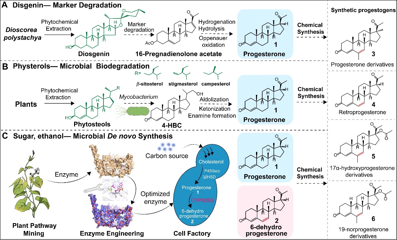 近期,永兴集团yx5978微生物代谢工程团队从药用植物通关藤(已被开发多种抗肿瘤中药)中鉴定了一个新颖的P450甾体Δ6脱氢酶(MtCYP82BQ1),该酶能催化孕酮在C6位选择性脱氢,生成6-脱氢孕酮,且对多种甾体底物(如17α-羟基黄体酮、睾酮、诺龙等)具有活性。基于此发现,研究人员运用合成生物学技术筛选和搭建了由植物来源的P450甾醇侧链裂解酶CcCYP87N1,3β-羟基类固醇脱氢酶/Δ5-Δ4酮类固醇异构酶CcHSD6,与Δ6-脱氢酶组成的从头生物合成通路,结合基因模块适配、酶工程与代谢工程,构建出能由葡萄糖和乙醇等简单碳源直接发酵生产孕酮与6-脱氢孕酮的“人工本草细胞”,其产量分别达到1.34 g/L与0.72 g/L。这项工作首次实现了非天然孕激素的高效从头合成,为甾体激素工业3.0(SHI 3.0)技术在绿色合成非天然甾体药物方面的巨大潜力提供了实证支持。